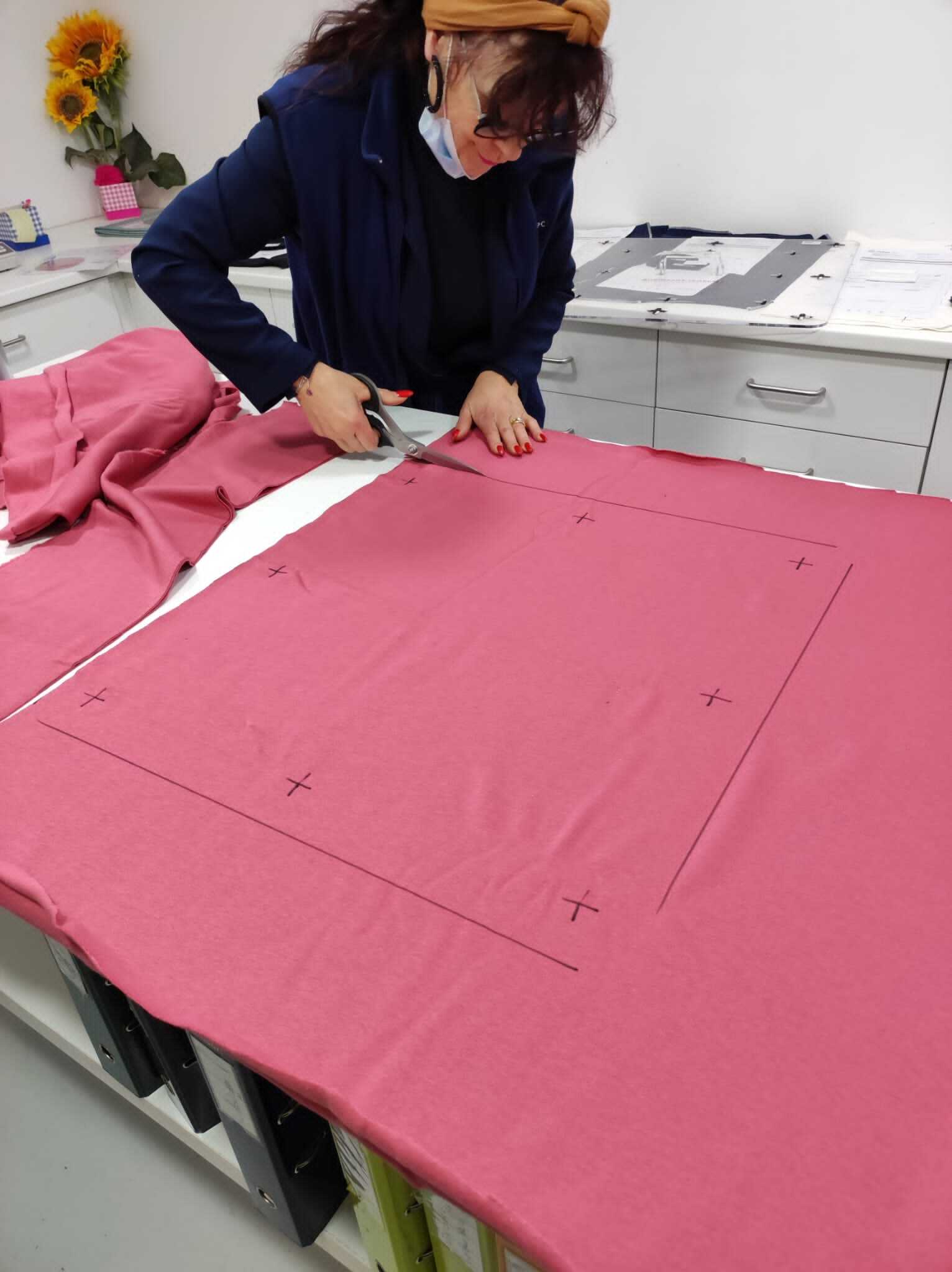 5. Zuschnitt des Jerseys: Der Jersey wird nach dem Schnittmuster zugeschnitten, wobei darauf geachtet wird, die Fadenrichtungen zu berücksichtigen. Dieser Schritt ist wichtig, um sicherzustellen, dass das T-Shirt die richtige Größe und Form hat. Auch kann dadurch der Verschnitt minimiert werden. ✂️