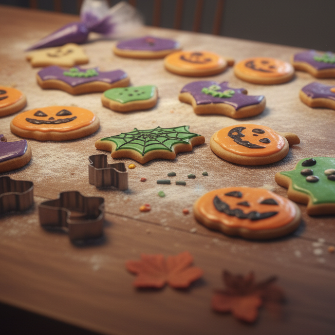 Besonders erwähnenswert: der selbstgemachte Zuckerguss und die Lebensmittelfarben in Orange, Lila, Schwarz und Grün – die perfekte Kombi für einen zauberhaften Halloween-Tisch! 🕸️