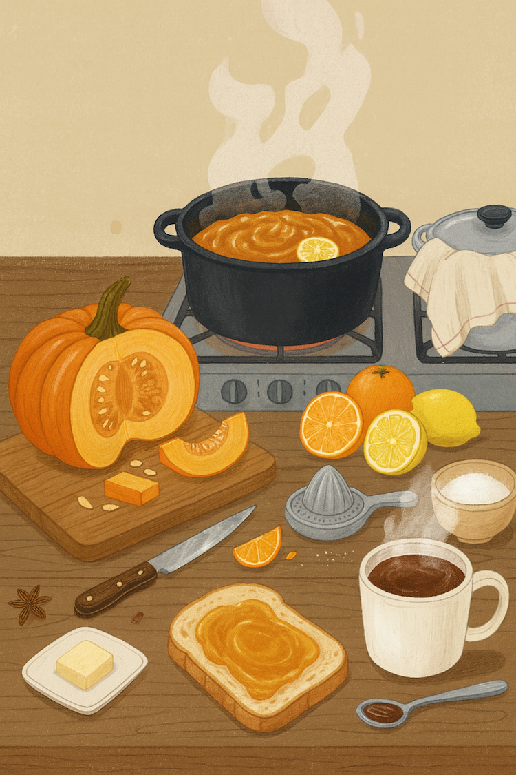 Margaux verwöhnt uns mit ihrer hausgemachten Marmelade aus Kürbis, Orangen und Zitronen. Ihr Geheimtipp? Sie lauwarm auf geröstetem Brot genießen, mit etwas gesalzener Butter – und das Ganze in eine dampfende Tasse heiße Schokolade tunken … Ja, viel gemütlicher kann man sich kaum auf die große Hexenjagd einstimmen. 🍞