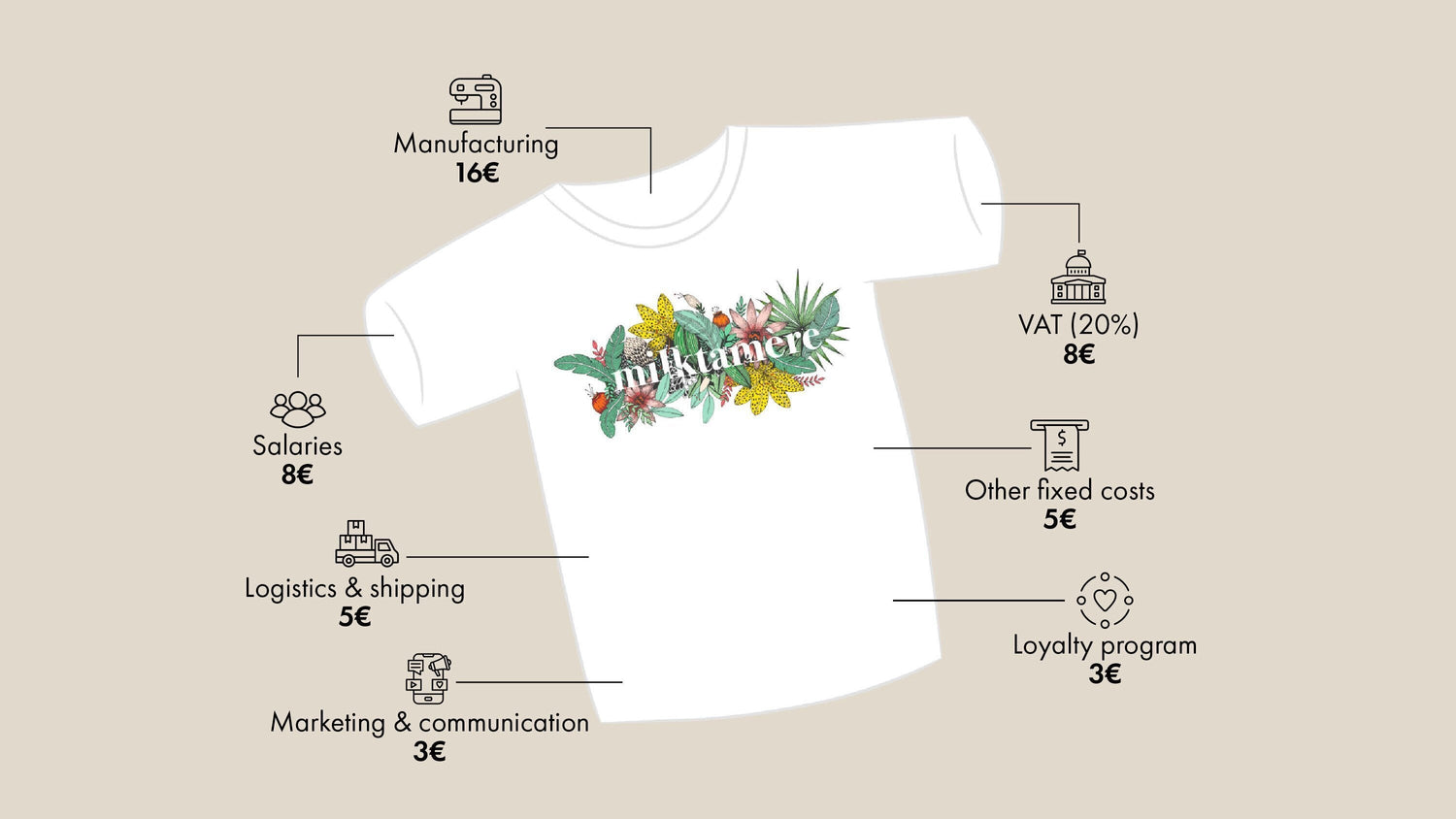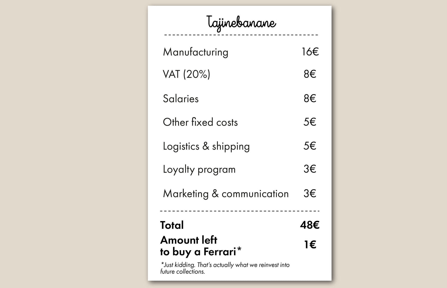 Und weil Transparenz Teil unseres Engagements ist, möchten wir Dir hier zeigen, wie sich der Preis eines Tajinebanane-T-Shirts ganz konkret zusammensetzt.